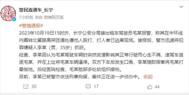 ·男子別停出租車(chē)打暈司機(jī),警方:對(duì)出租車(chē)突然變道心懷不滿,已刑拘。