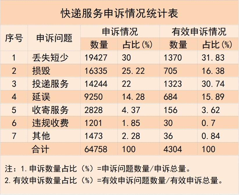 三、快遞服務申訴情況1.快遞服務申訴問題數(shù)量與類別情況。用戶對快遞服務問題申訴64758件,其中有效申訴4304件,占比6.65%。有效申訴涉及的主要問題依次是快件丟失短少、投遞服務和快件損毀,分別占有效申訴總量的31.83%、30.74%和16.38%。