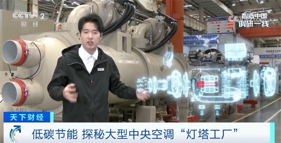 總臺央視記者 吳柏辰:今天我們來到的是位于山東青島的一家生產(chǎn)中央空調(diào)的“燈塔工廠”,這里生產(chǎn)的空調(diào)跟我們平時家用的不一樣,我身邊這樣的大家伙就是一臺商用中央空調(diào)的主機。要知道一棟寫字樓或者商場,空調(diào)制冷和制熱的能耗往往能能夠占到整體能耗的60%以上。這種大型空調(diào)如何用最少的電獲得最大的制冷或制熱效果?關鍵就在于空調(diào)主機的壓縮機,我們可以看到在這臺空調(diào)頂端的這個白色裝置氣懸浮壓縮機,它采用的就是一種空氣動力學技術(shù)。就像我們熟知的飛機機翼通過上下空氣流動的速度不同所產(chǎn)生的浮力,它就運用了同樣的原理。