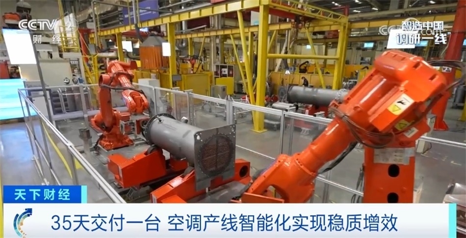 可以看到我身邊這條過道旁擺滿了產(chǎn)品,目前這家工廠所生產(chǎn)的中央空調(diào)處于訂單爆滿的狀態(tài)。生產(chǎn)一臺中央空調(diào)所需要的工序能夠達到上百道,目前這座“燈塔工廠”目前能夠做到最快35天交付產(chǎn)品,這與超級產(chǎn)線背后的智能化改造密不可分。空調(diào)主機下方的大型腔體,它內(nèi)部最多將安裝上千根換熱銅管,這些銅管與腔體之間沒有任何的焊接或黏合,是完全通過膨脹變形來完成固定與密封。這就意味著銅管安裝的好壞直接決定了這臺主機會不會泄漏制冷劑。目前這道工序已經(jīng)交由機械臂來完成,不僅安裝的時間由原來人工的兩個小時縮短至四十五分鐘,而且通過人工智能視覺檢測技術(shù),保障空調(diào)主機零泄漏。