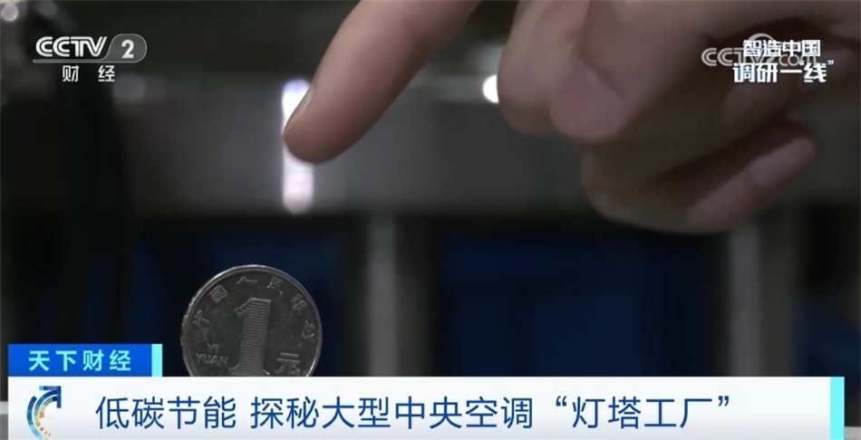 我現(xiàn)在走進的這個區(qū)域是空調(diào)產(chǎn)線的末端——檢測平臺。每一臺空調(diào)出廠前都要在這里經(jīng)過全方位的檢測。眼前這就是一臺正在運轉(zhuǎn)的氣懸浮中央空調(diào),我們在空調(diào)上立了一枚硬幣,可以看到是紋絲不動的,這也是氣懸浮的特點之一——運行比較平穩(wěn)。在這塊屏幕上顯示著空調(diào)的出水溫度7℃,恒定的出水溫度讓這臺空調(diào)產(chǎn)生的冷風非常柔和。目前,這座工廠全流程的自動化生產(chǎn)能夠滿足從小型商用空調(diào)生產(chǎn)到用戶需求的大規(guī)模定制。目前低能耗、智能化產(chǎn)品已應用在商業(yè)地產(chǎn)、酒店、軌道交通等各種場景,極大程度助力著國家“雙碳”政策以及各大行業(yè)的低碳轉(zhuǎn)型。