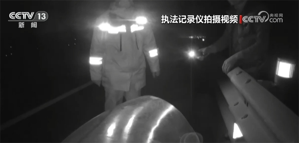 再來看前些天發(fā)生在京臺高速山東德州段的這一幕。晚上八點多,德州高速交警在轄區(qū)巡查時,發(fā)現(xiàn)在京臺高速往濟南方向的這一處內(nèi)側(cè)行車道上,掉落了一個大型管道,前方不遠處有一輛大型貨車正停在應急車道內(nèi),而貨車駕駛?cè)苏驹谥醒胱o欄內(nèi),用手電筒提醒過往車輛。由于晚上途經(jīng)的大都是大型車輛,夜間視距較差,情況十分危險,現(xiàn)場交警分工配合,通過多次嘗試終于跑到了遺落物的旁邊進行處置。