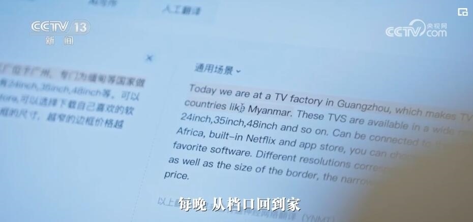 方菁:這是我們找的專門做外貿(mào)電視機的一家(工廠)。我給大家介紹一下,“大家好,我是方菁,今天我們來到了電視機工廠”。要介紹得更精密的時候,我就不知道該怎么說了。打開我的翻譯軟件,先把我要呈現(xiàn)的字幕輸入進去。