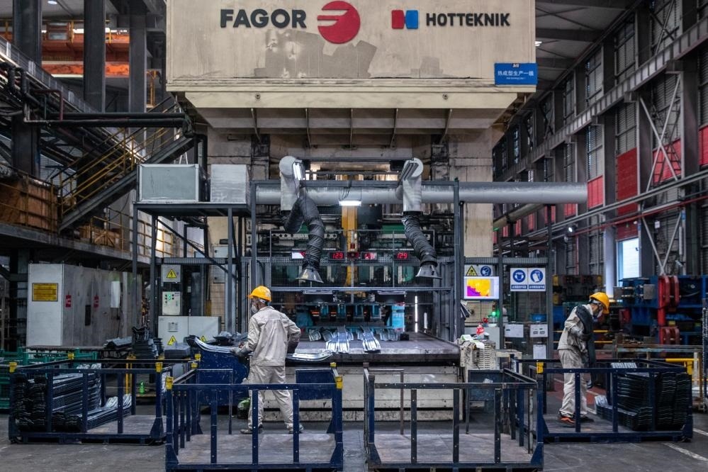 在位于重慶市兩江新區(qū)的一家機械設備生產企業(yè)的熱壓車間,工人將剛下線的零件裝箱(2023年7月16日攝)。新華社記者儲加音攝