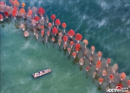 11月14日,初冬時節(jié),安徽省寧國市方塘鄉(xiāng)青龍灣濕地的紅杉林美如油畫,游客乘坐竹筏在紅杉林中游覽觀光。