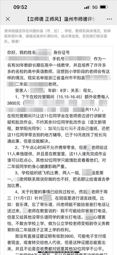 ·溫州一小學老師被舉報開展有償答疑,當地教育局:成立專班調查取證。