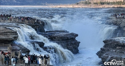 2023年11月14日,初冬時節(jié),陜西延安,游人在黃河壺口瀑布陜西側游覽觀瀑。