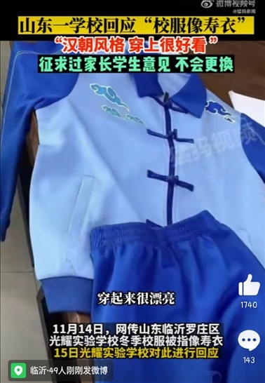 ·山東一學校校服被質(zhì)疑像壽衣,當?shù)亟腆w局:該樣式方案已被淘汰。