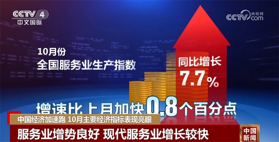 再來看服務(wù)業(yè)。服務(wù)業(yè)增勢良好,現(xiàn)代服務(wù)業(yè)增長較快。10月份,服務(wù)業(yè)生產(chǎn)指數(shù)同比增長7.7%,比上月加快0.8個百分點。其中,住宿和餐飲業(yè)、批發(fā)和零售業(yè)、交通運輸倉儲和郵政業(yè)等聚集型服務(wù)業(yè)都保持兩位數(shù)增長。