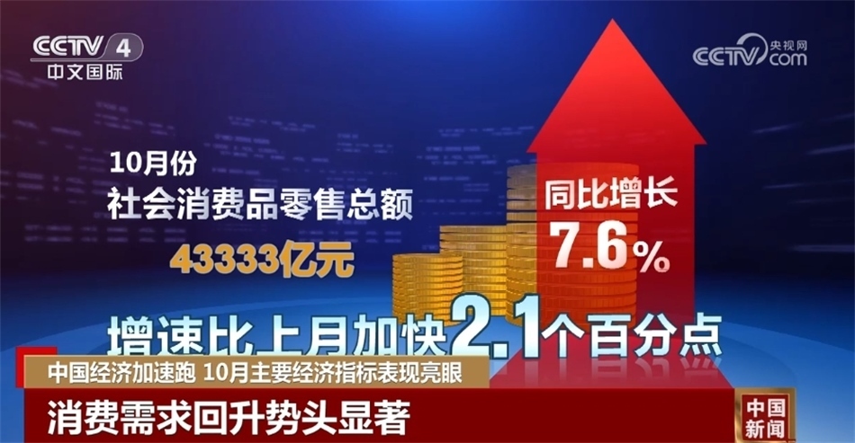央視網(wǎng)消息:來關(guān)注中國經(jīng)濟10月報。國家統(tǒng)計局昨天(11月15日)發(fā)布了10月份經(jīng)濟主要指標(biāo)。數(shù)據(jù)顯示,隨著宏觀調(diào)控政策持續(xù)發(fā)力顯效,全國生產(chǎn)供給穩(wěn)中有升,市場需求持續(xù)改善,就業(yè)物價總體穩(wěn)定,高質(zhì)量發(fā)展扎實推進(jìn),國民經(jīng)濟持續(xù)恢復(fù)向好。