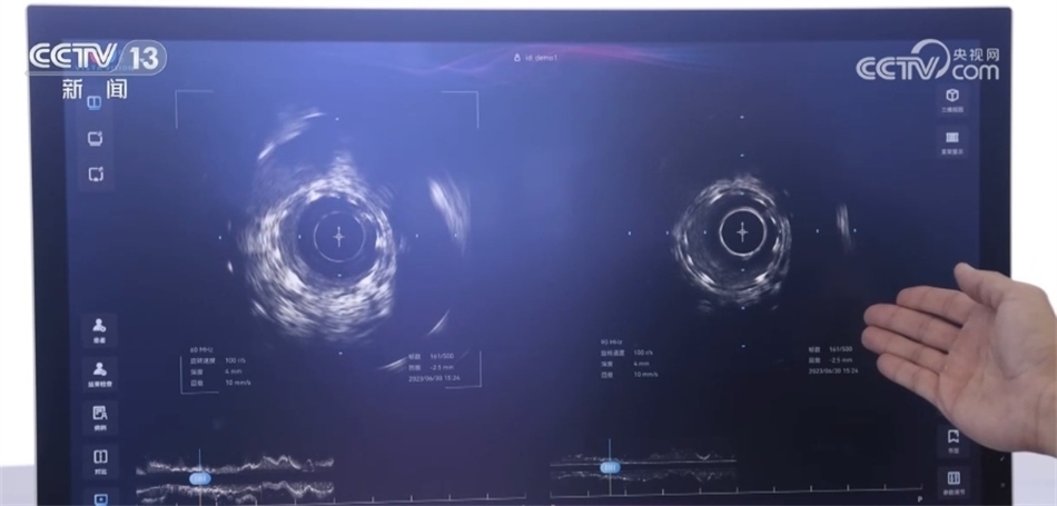 總臺央視記者 褚爾嘉:這里是一個傳統(tǒng)的血管的超聲圖像,我們可以看到血管的全貌。右邊這里是一個工作頻率高達100兆赫茲的超高頻的血管內超聲圖像,通過技術升級,現(xiàn)在我們可以更加清晰地看到冠狀動脈的精細結構,這也是目前世界上清晰度最高的一個血管內的超聲圖像。