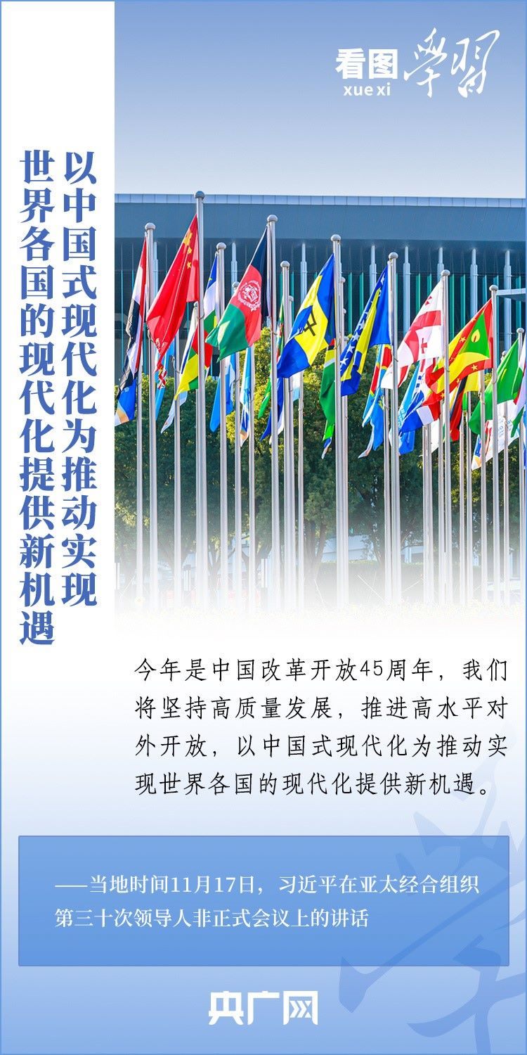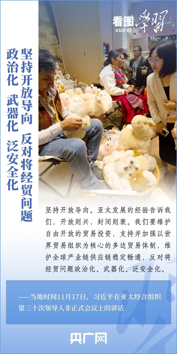 當(dāng)?shù)貢r(shí)間11月17日上午,亞太經(jīng)合組織第三十次領(lǐng)導(dǎo)人非正式會(huì)議在美國(guó)舊金山舉行。國(guó)家主席習(xí)近平出席會(huì)議并發(fā)表題為《堅(jiān)守初心 團(tuán)結(jié)合作 攜手共促亞太高質(zhì)量增長(zhǎng)》的重要講話。習(xí)主席在講話中全面闡述了中國(guó)對(duì)深化亞太合作、促進(jìn)地區(qū)和世界經(jīng)濟(jì)增長(zhǎng)的重要主張,以“四個(gè)堅(jiān)持”提出多項(xiàng)務(wù)實(shí)舉措,希望同各方一道努力,共同打造亞太下一個(gè)“黃金三十年”。一起來(lái)學(xué)習(xí)!