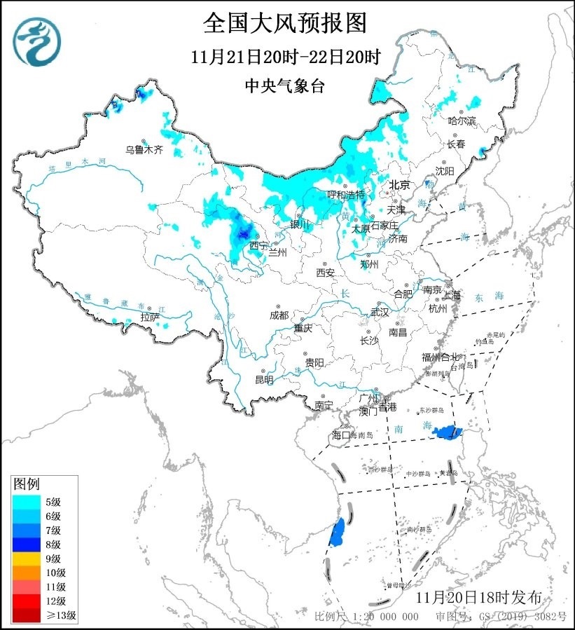 11月21日20時至22日20時,新疆北部、內蒙古大部、甘肅西北部、青海北部、寧夏北部、陜西北部、山西大部、河北西部、黑龍江西部、吉林東部等地部分地區(qū)將有5~6級、陣風7~8級的大風;巴士海峽、南海中東部和西南部海域將有7~8級、陣風9級的大風。