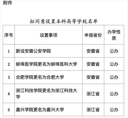·教育部:擬同意設(shè)置安徽公安學(xué)院等5所學(xué)校。