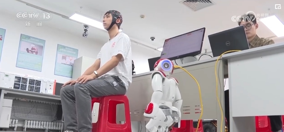 記者來到這間研發(fā)人形機器人的實驗室時,科研團隊正在測試機器人的同步能力。眼前的機器人不僅可以通過攝像頭,捕捉人們的動作后進行同步模仿,還可以通過腦機接口、肌電交互等方式,捕捉人們的腦電信息和運動意圖,直接同步控制機器人的行為。