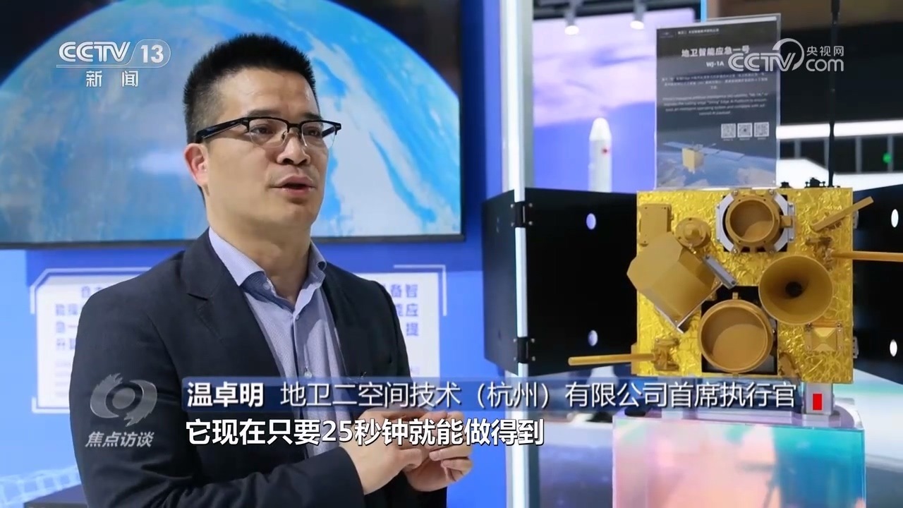 地衛(wèi)二空間技術(shù)(杭州)有限公司首席執(zhí)行官溫卓明:“這是一個(gè)聰明的衛(wèi)星,傳統(tǒng)的衛(wèi)星6個(gè)小時(shí)才能干完的事情,它只要25秒鐘就能做得到,而且原來可能要5000個(gè)工程師干的活,現(xiàn)在1個(gè)小時(shí)它就能做完。它是怎么能做到的?因?yàn)槲覀儼讶斯ぶ悄芊诺搅颂铡!?/p>