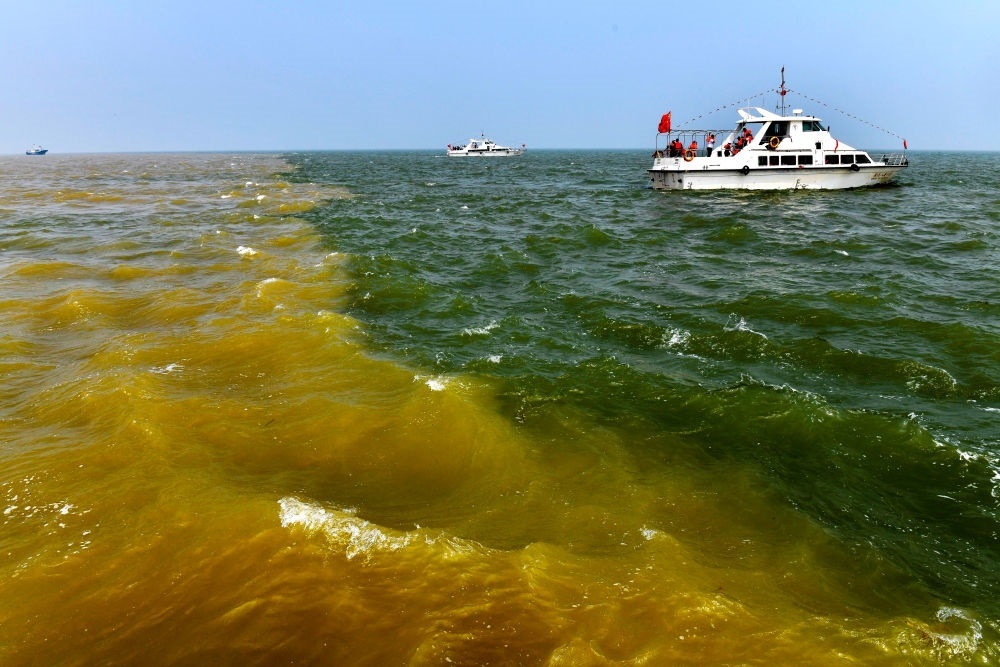在山東省東營市黃河入???,黃河匯入渤海,形成獨(dú)特景觀(2021年5月13日攝)。