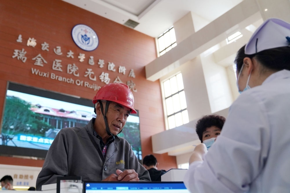 2023年5月18日,在位于江蘇省無(wú)錫市的上海交通大學(xué)醫(yī)學(xué)院附屬瑞金醫(yī)院無(wú)錫分院,就診者在服務(wù)臺(tái)咨詢。