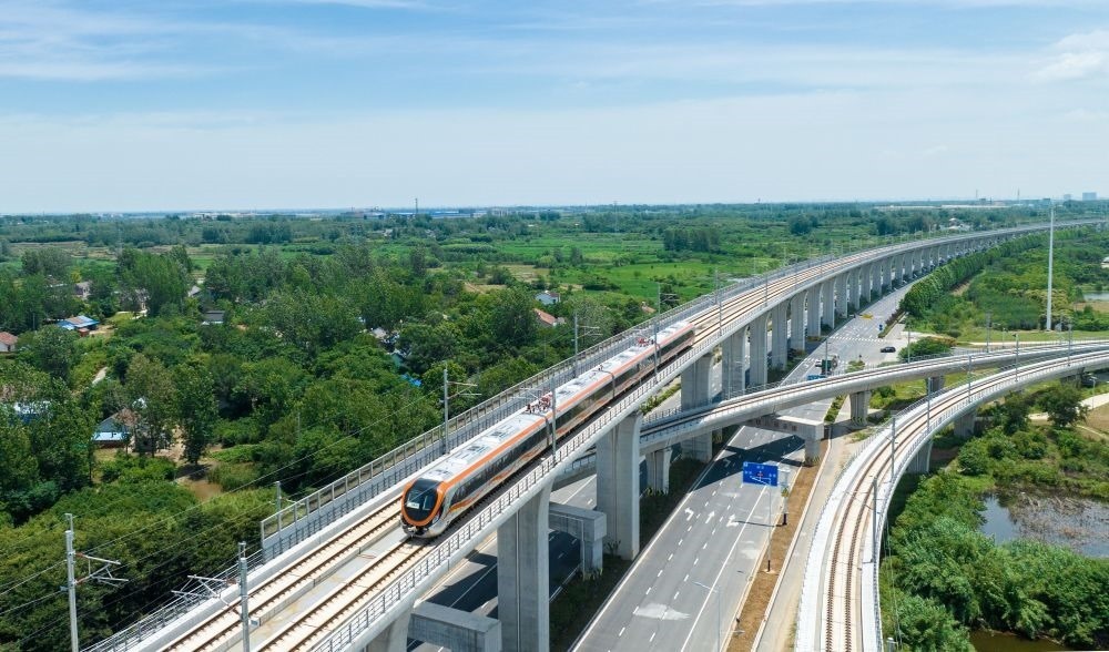 這是在安徽省滁州市來(lái)安縣境內(nèi)拍攝的滁寧城際鐵路列車(chē)(2023年6月28日攝,無(wú)人機(jī)照片)。當(dāng)日,滁寧城際鐵路滁州段開(kāi)通運(yùn)營(yíng)。滁寧城際鐵路西起滁州高鐵站,止于正在規(guī)劃建設(shè)中的南京北站,全長(zhǎng)約55公里。