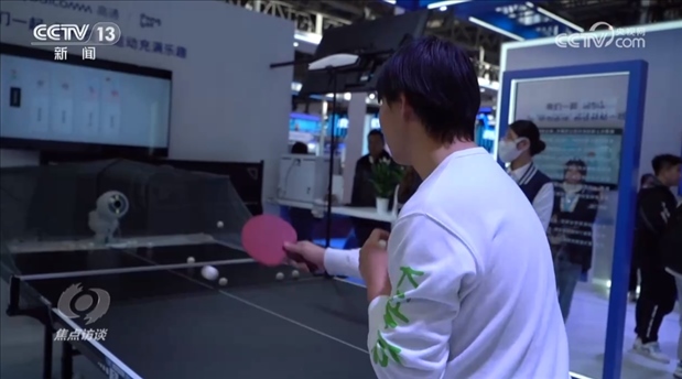 數字科技鏈的展館有一臺全球首款擬人型發(fā)球機器人,能實時捕捉高速乒乓球的軌跡,生成專業(yè)報告,數字科技讓運動變得更加有趣。