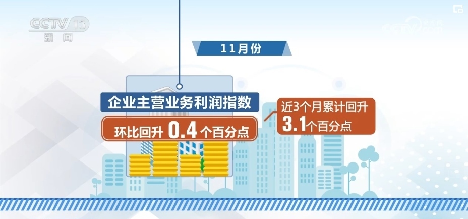 從分項指數(shù)來看,11月份,企業(yè)主營業(yè)務(wù)利潤指數(shù)環(huán)比回升0.4個百分點,近3個月累計回升3.1個百分點。
