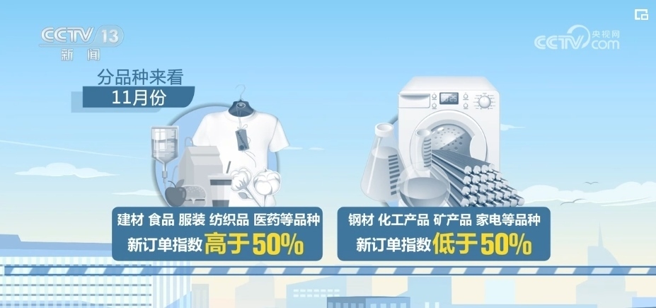 分品種來看,11月份,建材、食品、服裝、紡織品、醫(yī)藥等品種的新訂單指數(shù)高于50%。鋼材、化工產(chǎn)品、礦產(chǎn)品、家電等品種的新訂單指數(shù)低于50%。