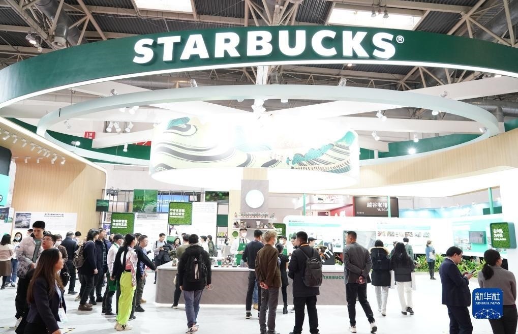 這是在首屆中國(guó)國(guó)際供應(yīng)鏈促進(jìn)博覽會(huì)健康生活鏈展區(qū)拍攝的星巴克展位(2023年11月28日攝)。新華社記者 任超 攝