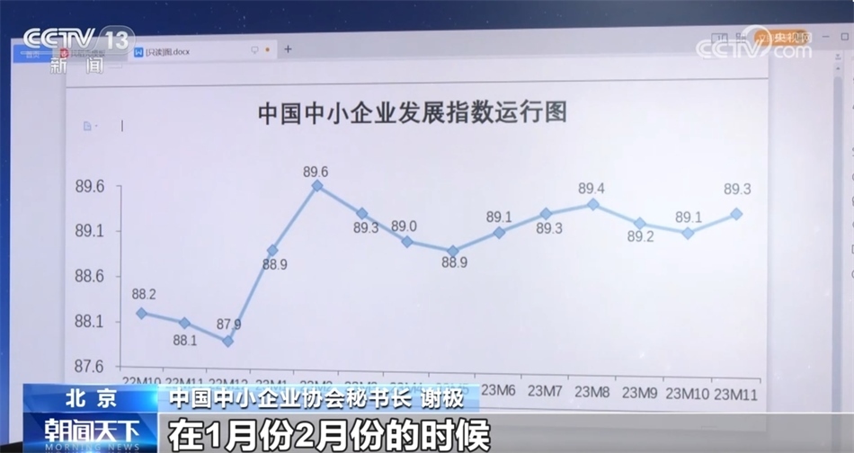 總臺(tái)央視記者 王雷:2023年的中國(guó)中小企業(yè)發(fā)展指數(shù)總體呈現(xiàn)出波浪式上升的走勢(shì)。通過(guò)對(duì)數(shù)據(jù)的分析,我們還發(fā)現(xiàn),隨著眾多中小企業(yè)加快產(chǎn)業(yè)、產(chǎn)品升級(jí),它們的競(jìng)爭(zhēng)力也在不斷增強(qiáng)。對(duì)比去年11月份和今年11月份的數(shù)據(jù),宏觀經(jīng)濟(jì)感受指數(shù)是分項(xiàng)指數(shù)中升幅最大的,一共上升了2.5點(diǎn)。