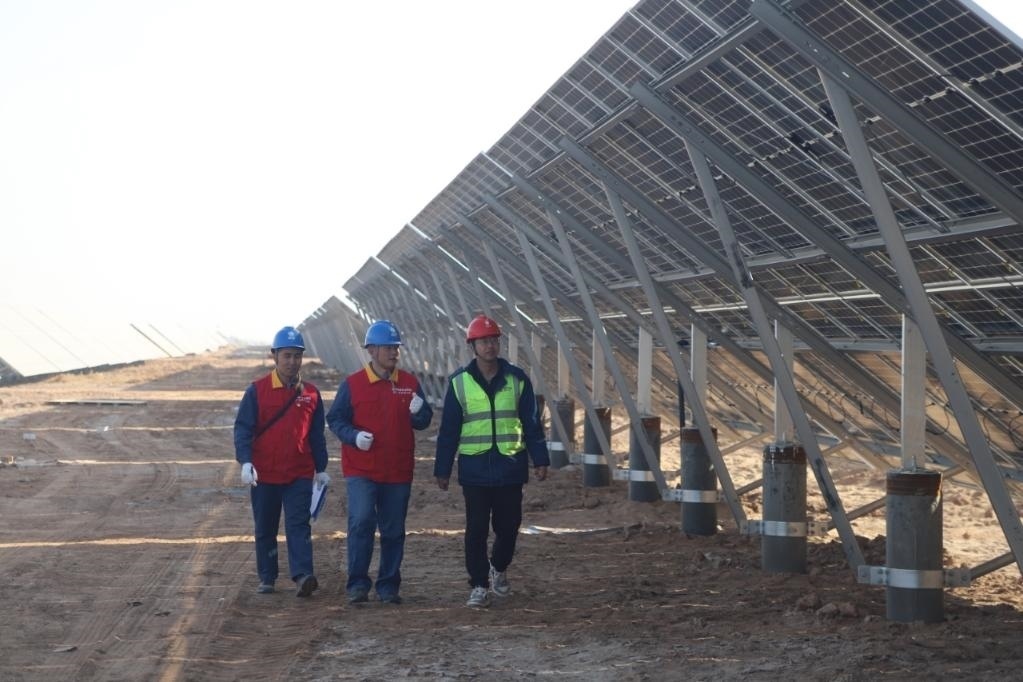 12月8日,國網(wǎng)阿克蘇供電公司工作人員來到國家電投阿拉爾光伏一電站進行隱患排查。(馬海驕 攝)