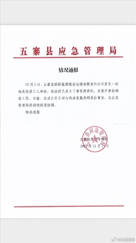 ·國(guó)新能源煤炭運(yùn)銷公司發(fā)生墜亡事故,山西省忻州市五寨縣官方:展開(kāi)調(diào)查。