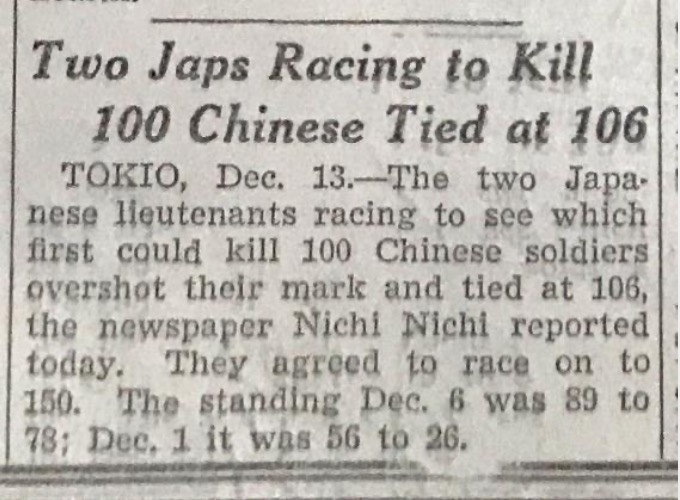 “根據(jù)《東京日日新聞》報道,兩名日本軍官比賽看誰能先殺死100名中國士兵,結(jié)果都?xì)⒘顺^100人,雙方打平殺了106人,他們又同意重新比賽殺到150人為止,12月6日是89比78,12月1日是56比26。”這是1937年12月14日發(fā)行的《芝加哥每日論壇》中,一篇有關(guān)兩名日本軍官進(jìn)行“百人斬”殺人競賽的報道節(jié)選。