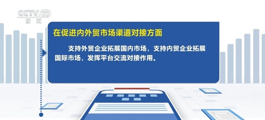 在促進(jìn)內(nèi)外貿(mào)市場(chǎng)渠道對(duì)接方面,支持外貿(mào)企業(yè)拓展國(guó)內(nèi)市場(chǎng),支持內(nèi)貿(mào)企業(yè)拓展國(guó)際市場(chǎng),發(fā)揮平臺(tái)交流對(duì)接作用。