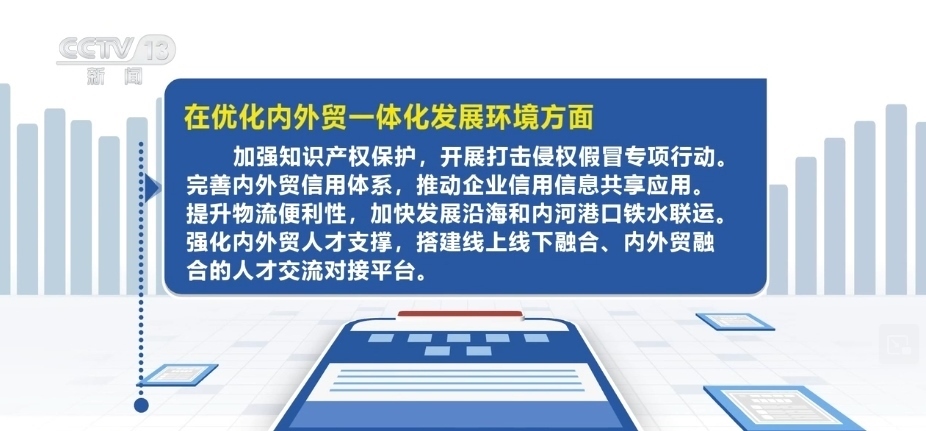 在優(yōu)化內(nèi)外貿(mào)一體化發(fā)展環(huán)境方面,加強(qiáng)知識(shí)產(chǎn)權(quán)保護(hù),開(kāi)展打擊侵權(quán)假冒專項(xiàng)行動(dòng)。完善內(nèi)外貿(mào)信用體系,推動(dòng)企業(yè)信用信息共享應(yīng)用。提升物流便利性,加快發(fā)展沿海和內(nèi)河港口鐵水聯(lián)運(yùn)。強(qiáng)化內(nèi)外貿(mào)人才支撐,搭建線上線下融合、內(nèi)外貿(mào)融合的人才交流對(duì)接平臺(tái)。
