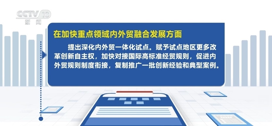 在加快重點(diǎn)領(lǐng)域內(nèi)外貿(mào)融合發(fā)展方面,提出深化內(nèi)外貿(mào)一體化試點(diǎn)。賦予試點(diǎn)地區(qū)更多改革創(chuàng)新自主權(quán),加快對(duì)接國(guó)際高標(biāo)準(zhǔn)經(jīng)貿(mào)規(guī)則,促進(jìn)內(nèi)外貿(mào)規(guī)則制度銜接,復(fù)制推廣一批創(chuàng)新經(jīng)驗(yàn)和典型案例。