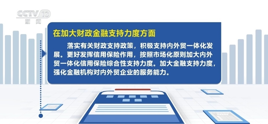 在加大財(cái)政金融支持力度方面,落實(shí)有關(guān)財(cái)政支持政策,積極支持內(nèi)外貿(mào)一體化發(fā)展。更好發(fā)揮信用保險(xiǎn)作用,按照市場(chǎng)化原則加大內(nèi)外貿(mào)一體化信用保險(xiǎn)綜合性支持力度。加大金融支持力度,強(qiáng)化金融機(jī)構(gòu)對(duì)內(nèi)外貿(mào)企業(yè)的服務(wù)能力。