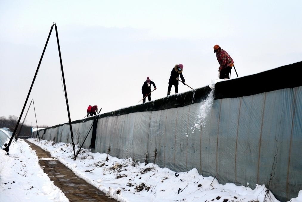 12月11日,河北省石家莊市欒城區(qū)崗頭村種植戶(hù)在清理大棚上的積雪。新華社記者 王曉 攝
