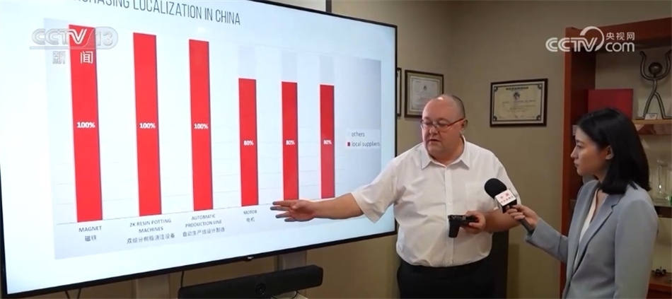 艾菲汽車零部件亞太區(qū)首席執(zhí)行官 埃里克·勒邁爾:從這張圖表中可以看出,就電機而言,我們使用的電機有80%來自當?shù)毓蹋盆F則100%來自當?shù)毓?,當?shù)毓藤|量好、價格低。