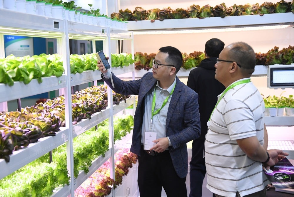 2023世界農(nóng)業(yè)科技創(chuàng)新大會(huì)11月2日至4日在北京舉行。這是2023年11月2日,工作人員(左)在世界農(nóng)業(yè)科技博覽會(huì)現(xiàn)場(chǎng)介紹智慧植物工廠(chǎng)。新華社記者 任超 攝
