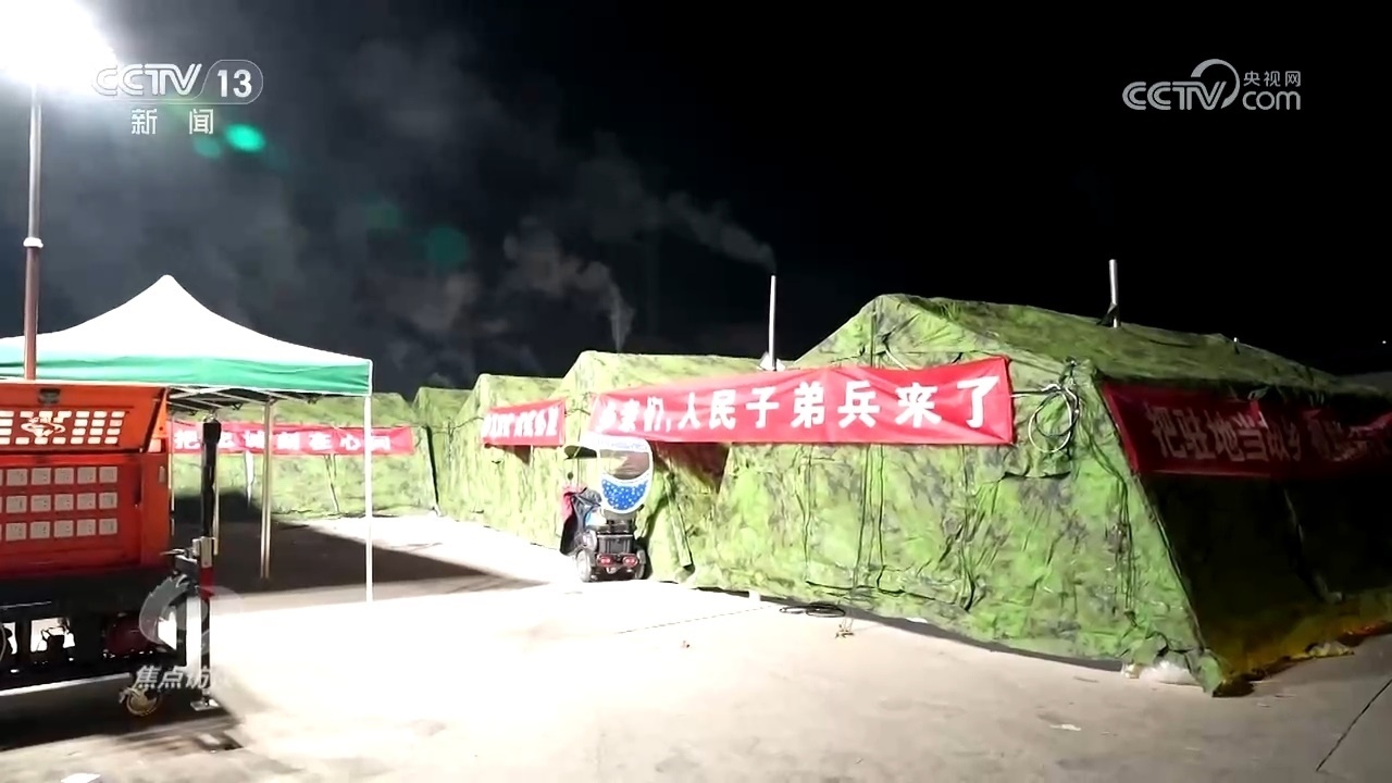 凌晨4時(shí),室外的溫度達(dá)到了零下13℃左右,安置點(diǎn)的每一頂帳篷里面都有一個(gè)取暖爐,取暖爐可以保證室內(nèi)的溫度,保證受災(zāi)群眾基本取暖需求。水果、飲料、榨菜、泡面這些基本應(yīng)急物資都有提供,還有一臺(tái)炊事車,部隊(duì)的炊事車可以提供熱食,像做米飯、饅頭,包括一些炒菜、湯都可以實(shí)現(xiàn),可以滿足受災(zāi)群眾的一日三餐,滿足他們的基本用餐需求。