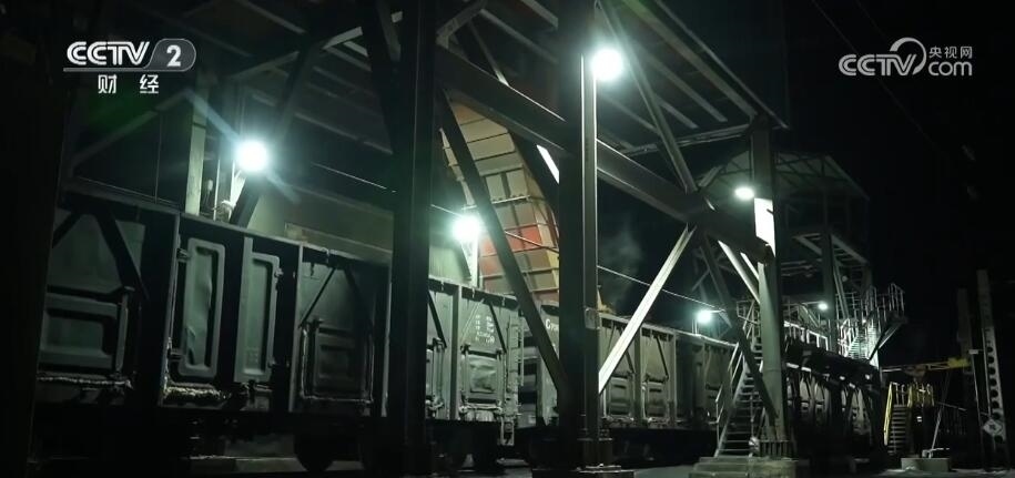 總臺記者 李大杰:我現(xiàn)在所在的位置是靖邊北站的一個煤炭裝運點,我身后正在運行的快速裝車系統(tǒng)正在將煤炭源源不斷地注入我身旁這列正在緩慢行駛的貨運列車當中,裝滿這一節(jié)車廂大概需要1分鐘,所有55節(jié)車廂全部裝滿大約能載煤3600噸。