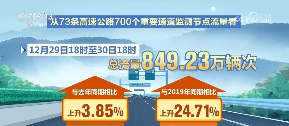 從公安部交管局選取的73條高速公路700個重要通道監(jiān)測節(jié)點(diǎn)流量看,12月29日18時(shí)至30日18時(shí)總流量849.23萬輛次,與去年同期相比上升3.85%,與2019年同期相比上升24.71%;從53條國道300個重要通道監(jiān)測節(jié)點(diǎn)流量看,12月29日18時(shí)至30日18時(shí)總流量183.01萬輛次,與去年同期相比上升21.37%,與2019年同期相比上升53.57%。