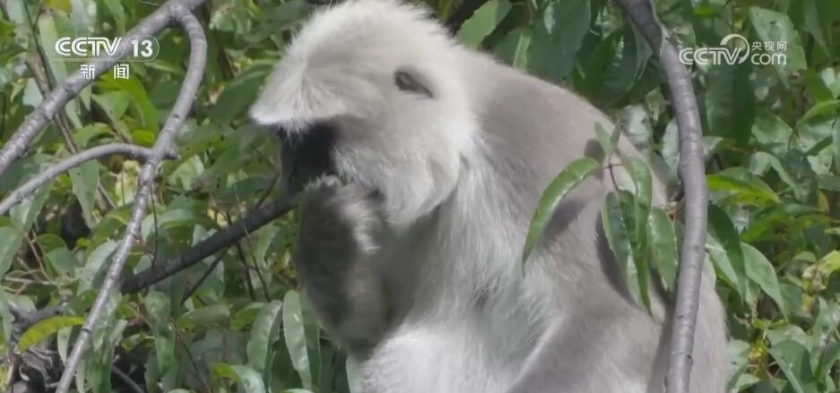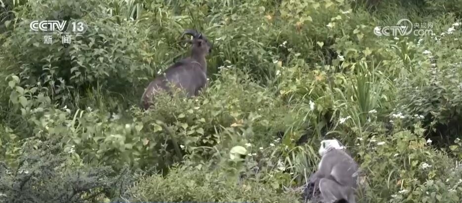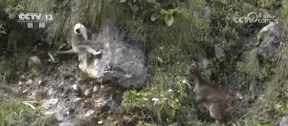 突然,林間騷動起來,幾只長尾葉猴從天而降來到塔爾羊中間,這是首次記錄到這兩個物種群體同框覓食的珍貴畫面。對它們而言,聚在一起可以加強(qiáng)警戒,更容易發(fā)現(xiàn)天敵。