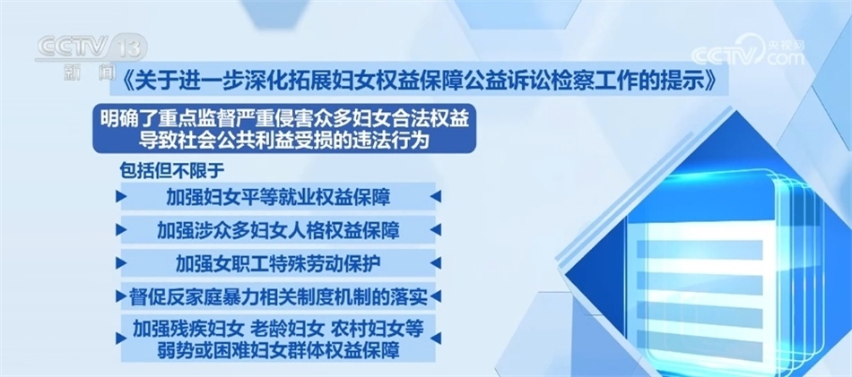 《工作提示》明確了重點監(jiān)督嚴重侵害眾多婦女合法權益導致社會公共利益受損的違法行為,包括但不限于:加強婦女平等就業(yè)權益保障,加強涉眾多婦女人格權益保障,加強女職工特殊勞動保護,督促反家庭暴力相關制度機制的落實,加強殘疾婦女、老齡婦女、農(nóng)村婦女等弱勢或困難婦女群體權益保障。同時,針對其他與眾多婦女權益密切相關的領域加強監(jiān)督。
