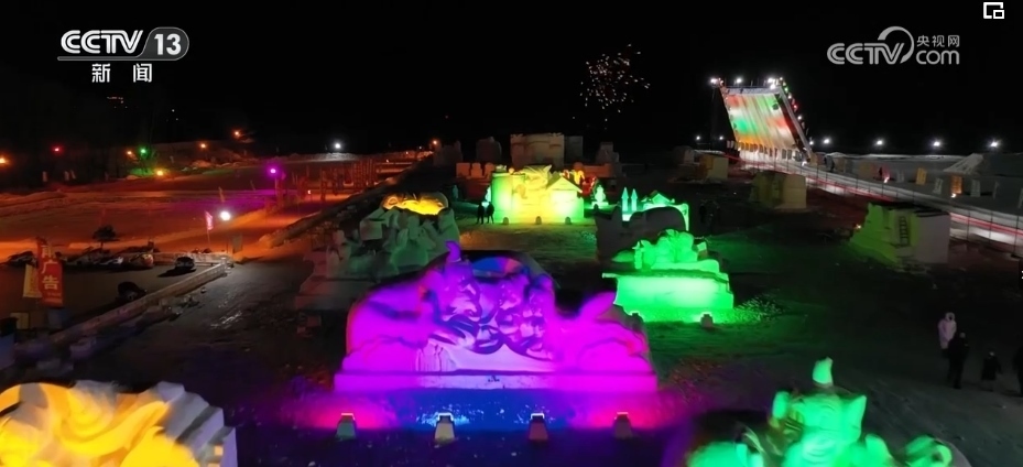 夜幕降臨,富錦市冰雪樂園一片流光溢彩,40余座雪雕景觀將童話里的人物搬到了現(xiàn)實(shí)。雪地大滑梯、雪地摩托車等娛樂項(xiàng)目也吸引了眾多游客前來游玩。