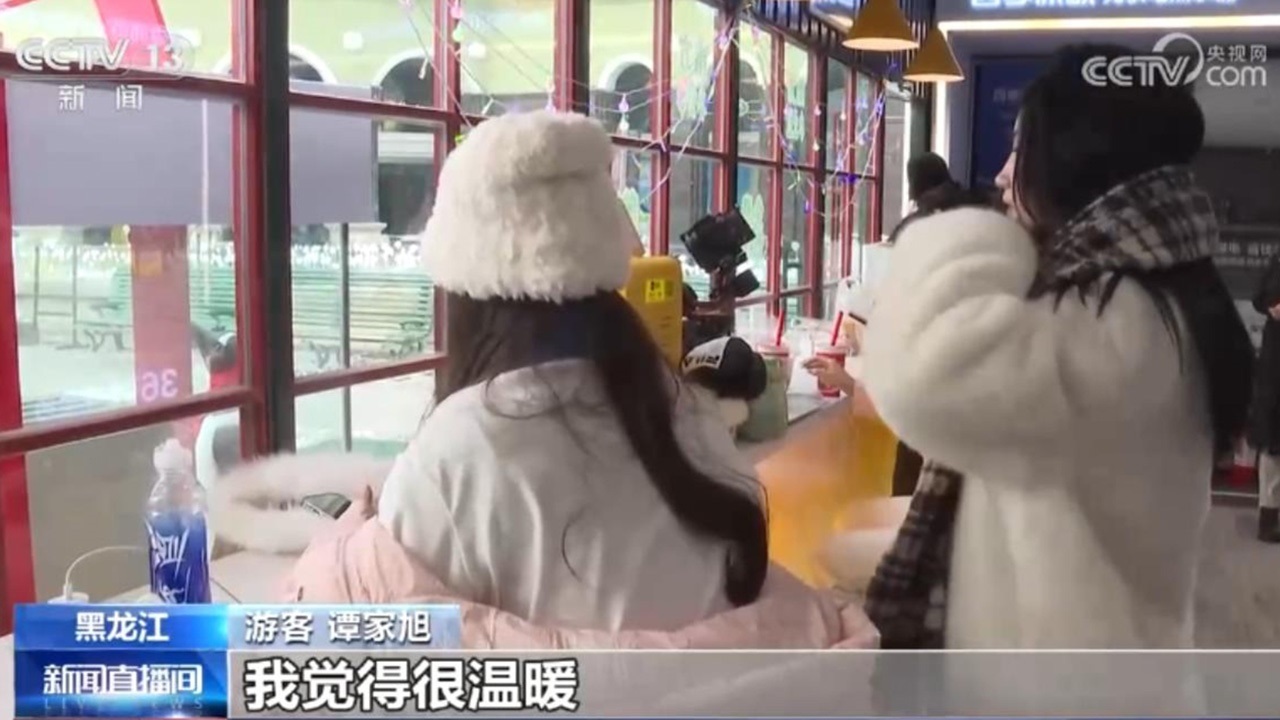 在哈爾濱建筑藝術(shù)廣場(chǎng),游人如織,游客拍照打卡之余,可以進(jìn)入旁邊的“溫暖驛站”短暫休息,免費(fèi)給手機(jī)充電,免費(fèi)喝熱水姜茶。