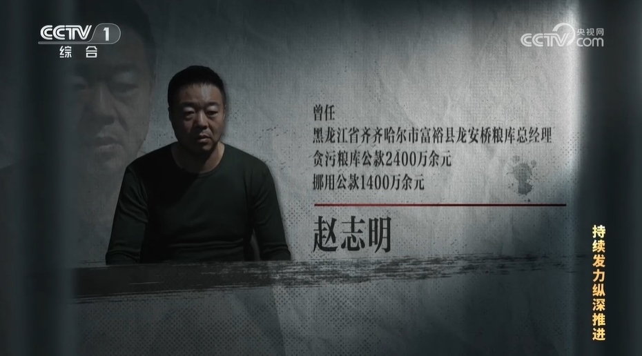 【解說詞】趙志明曾是黑龍江省齊齊哈爾市富裕縣龍安橋糧庫總經理,經查,他貪污糧庫公款2400萬余元,挪用公款1400萬余元,2023年3月被判處有期徒刑14年。龍安橋糧庫是在2015年由5家國有糧庫改革重組的,富??h政府持股51%、民營企業(yè)鼎倉公司持股49%。趙志明原本是鼎倉公司的老板,在這次改制中當上了龍安橋糧庫總經理。
