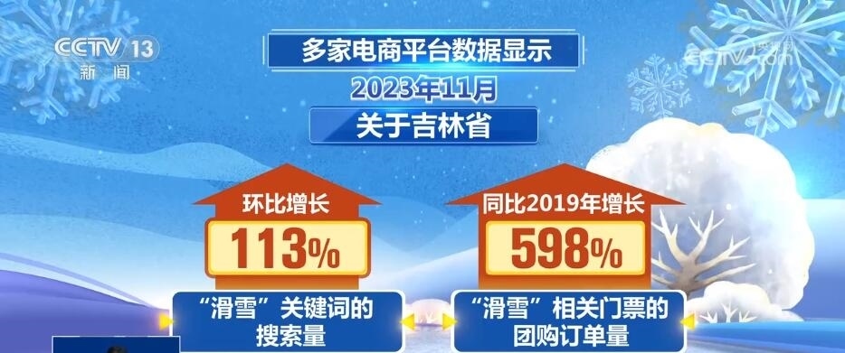 多家電商平臺(tái)數(shù)據(jù)顯示,2023年11月,關(guān)于吉林省“滑雪”關(guān)鍵詞的搜索量環(huán)比增長(zhǎng)113%,“滑雪”相關(guān)門票的團(tuán)購(gòu)訂單量同比2019年增長(zhǎng)了598%。