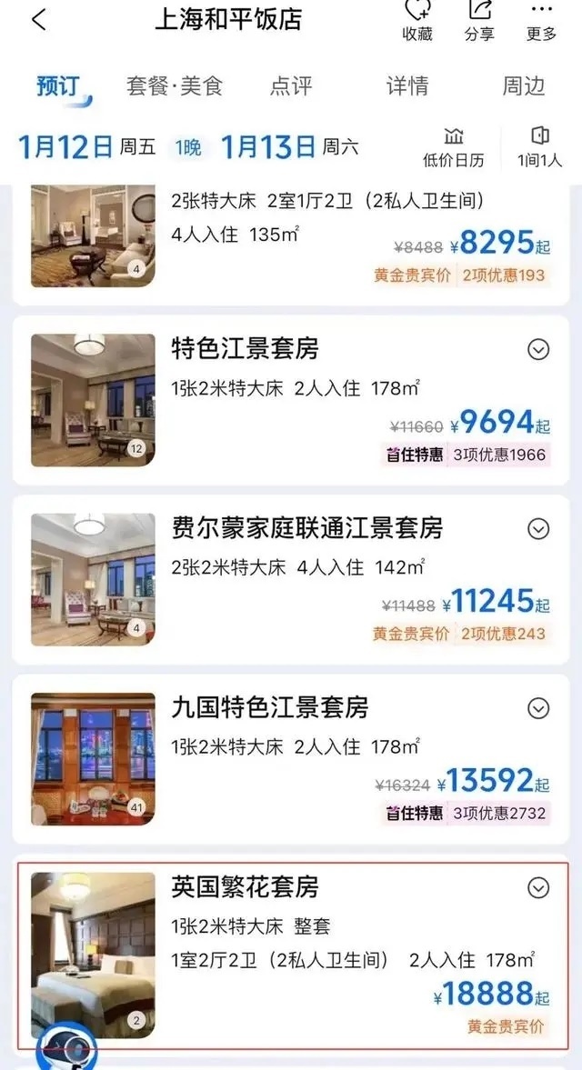 劇中出鏡率極高的和平飯店英國套房也成了“熱門產(chǎn)品”。目前,和平飯店英國套房在旅游平臺上被命名為“英國繁花套房”。9日查詢攜程旅行平臺發(fā)現(xiàn),9-11日該套房已售罄,12日入住一晚的價(jià)格為18888元。據(jù)媒體此前報(bào)道,這一套房在今年春節(jié)期間含早價(jià)為22888元一晚。