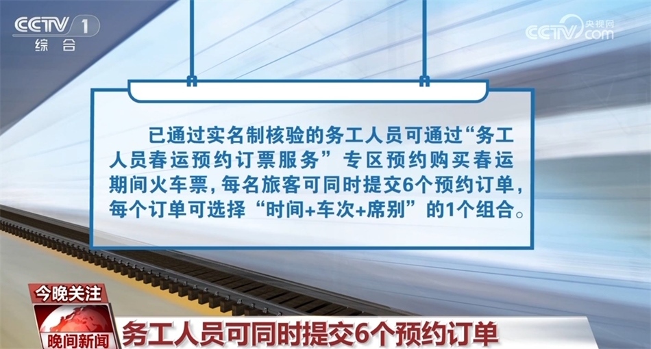 已通過實(shí)名制核驗(yàn)的務(wù)工人員可通過“務(wù)工人員春運(yùn)預(yù)約訂票服務(wù)”專區(qū)預(yù)約購(gòu)買春運(yùn)期間火車票,每名旅客可同時(shí)提交6個(gè)預(yù)約訂單,每個(gè)訂單可選擇“時(shí)間+車次+席別”的1個(gè)組合。