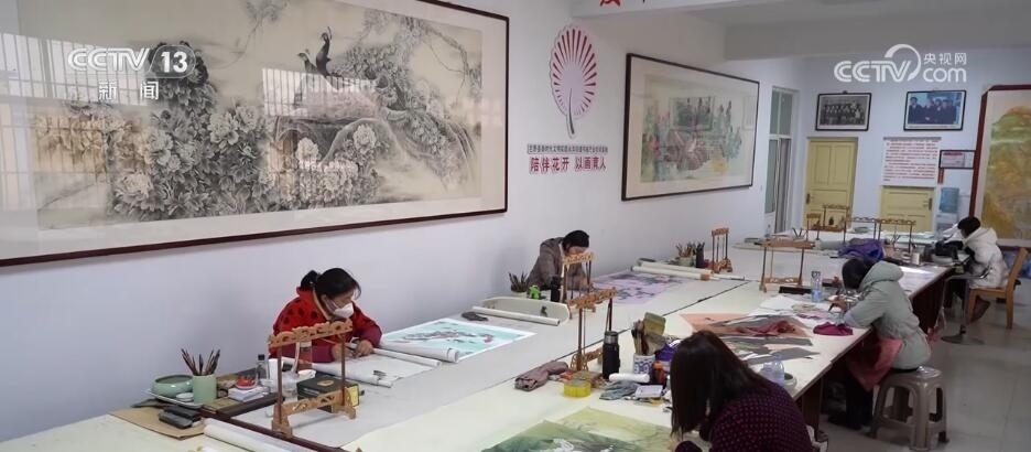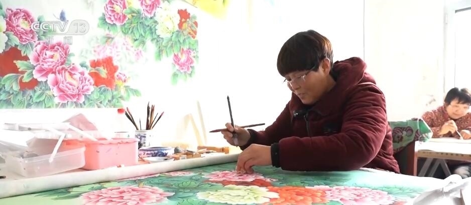 在巨野縣大義鎮(zhèn)王莊村這家新開(kāi)的畫室里,十幾位村民正在這里專心畫工筆牡丹畫。今年50多歲的曹春靈算是村里的老畫師了,平常農(nóng)忙的時(shí)候她就照顧家里10多畝地,農(nóng)閑的時(shí)候就作畫,每個(gè)月能掙兩三千塊錢。這不臨近春節(jié)畫賣得好,她干脆把兒媳婦也叫過(guò)來(lái),她今年的新打算是,要把兒媳培養(yǎng)成畫師。